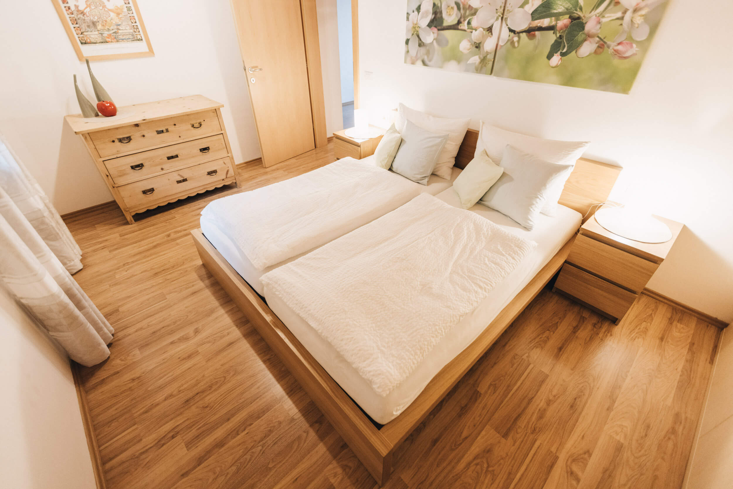 Unsere helle Ferienwohnung liegt im Dachgeschoss und bietet 56 m2 pursten Komfort mit zwei Schlafzimmern, einem geräumigen Badezimmer und einer Wohnküche. Auf der großzügigen Terrasse erwartet Sie ein fantastischer Panoramablick über Kaltern, den Kalterer See und die umliegenden Berge.